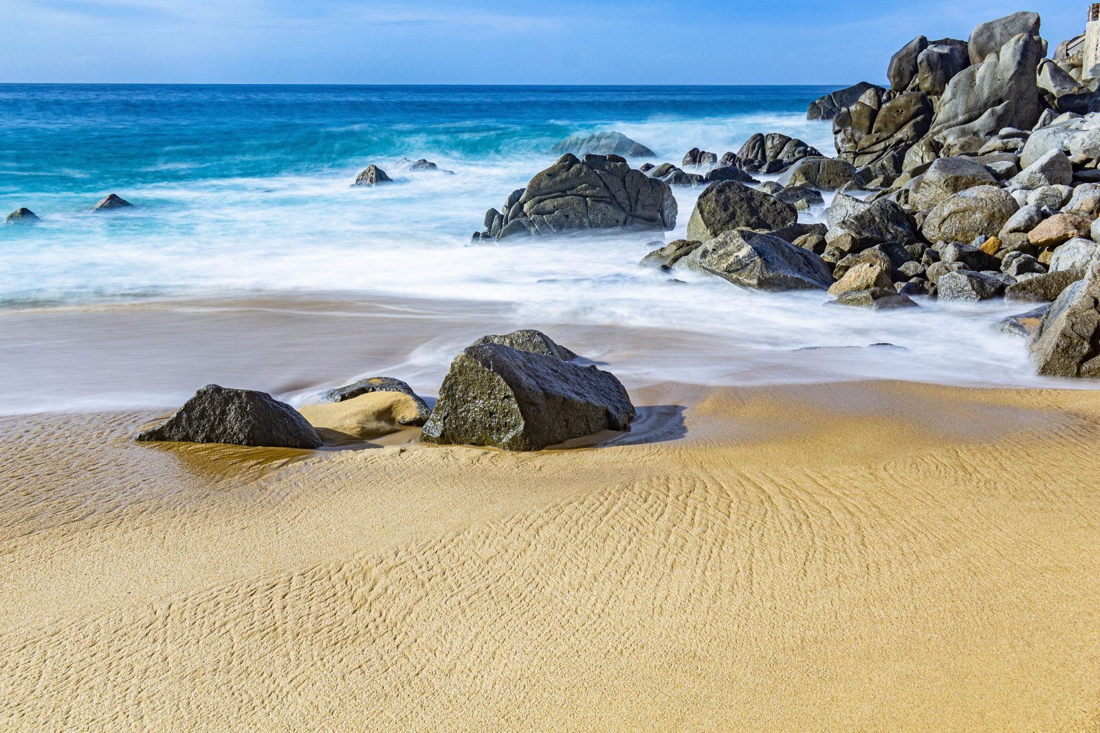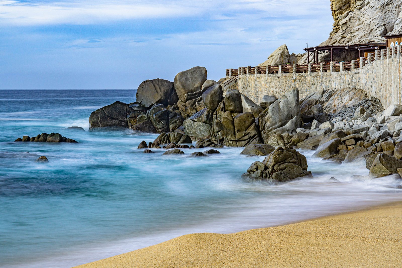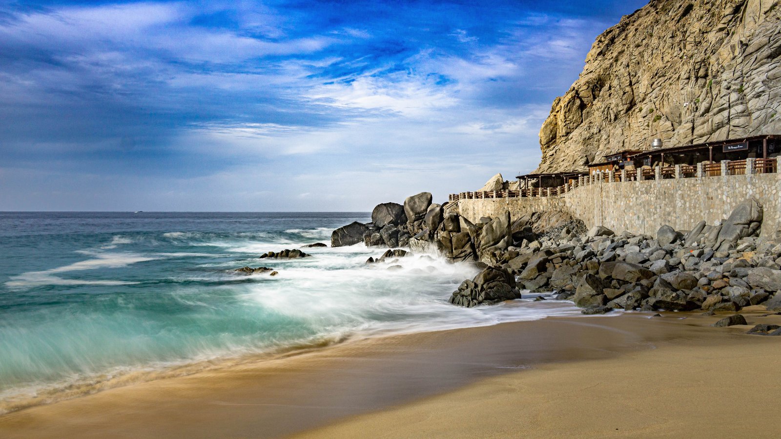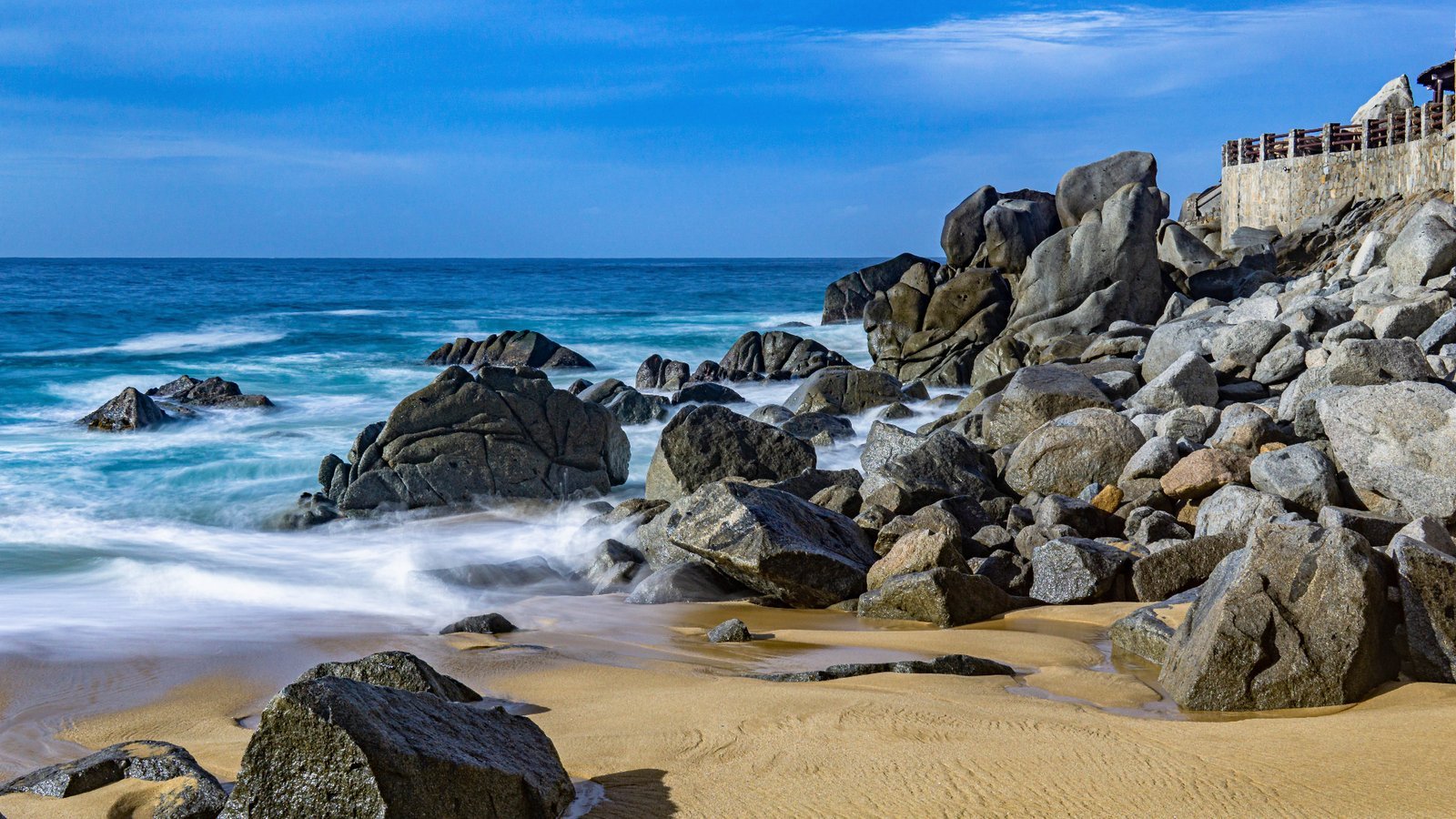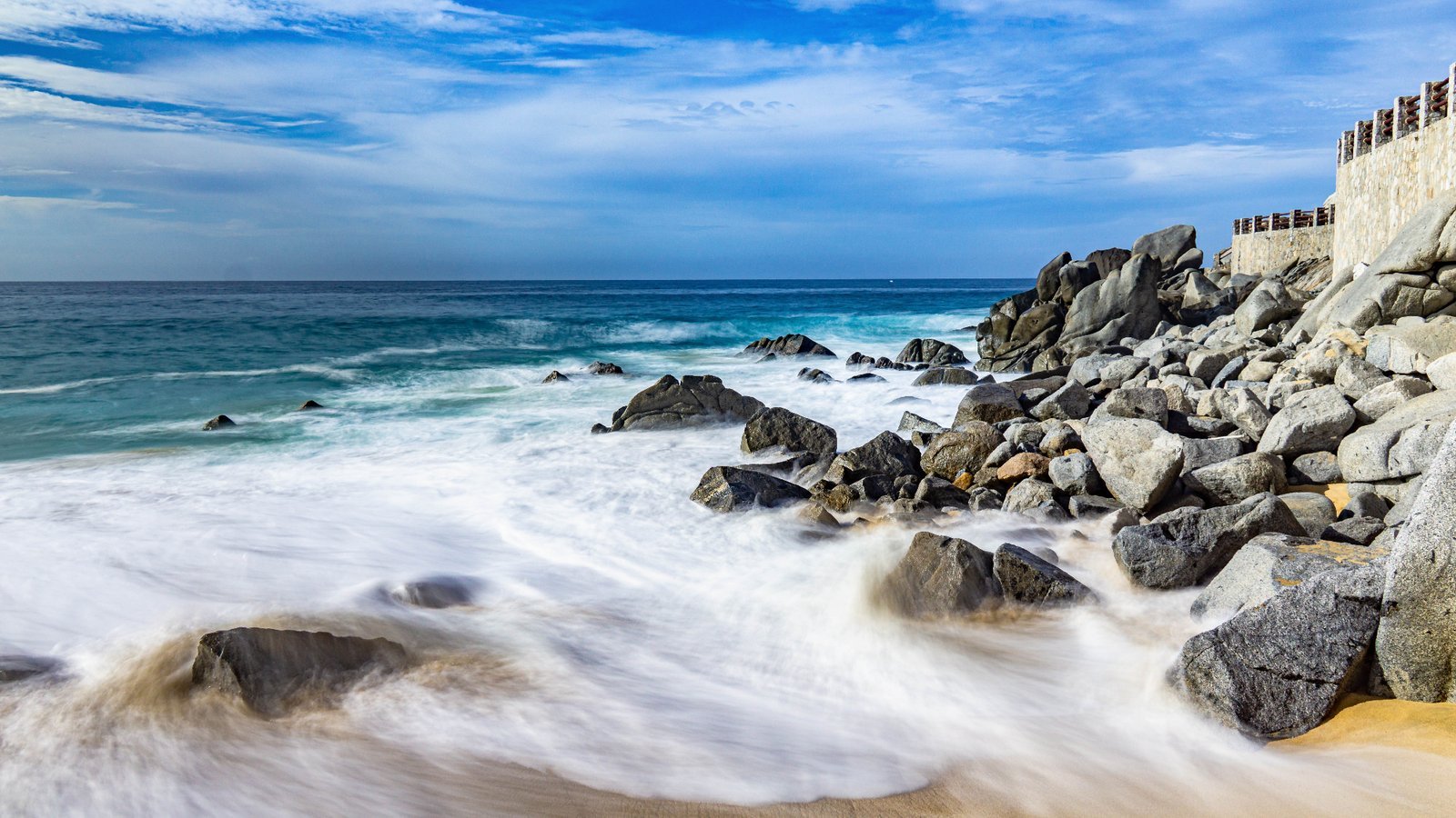 Beautiful Los Cabos beach featuring rocky formations and gentle waves, capturing the serene coastal landscape.