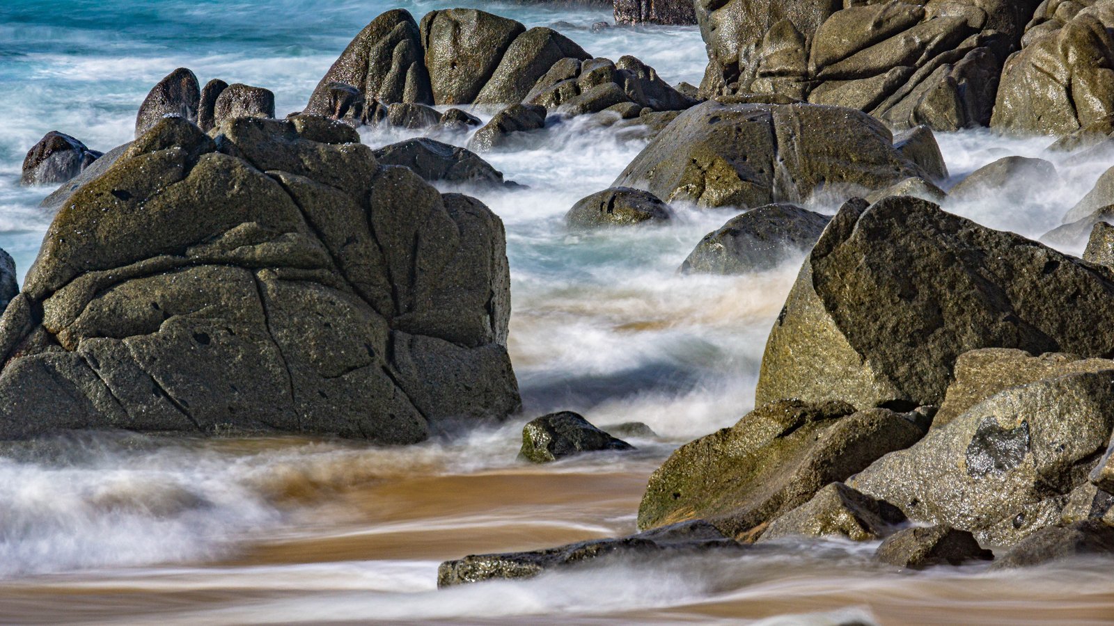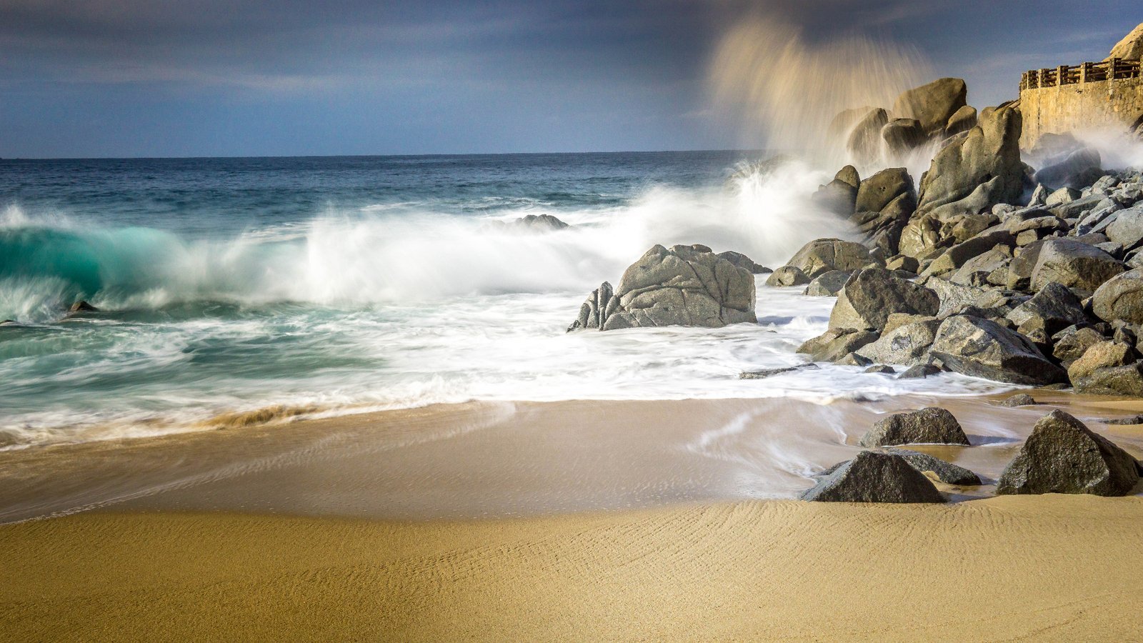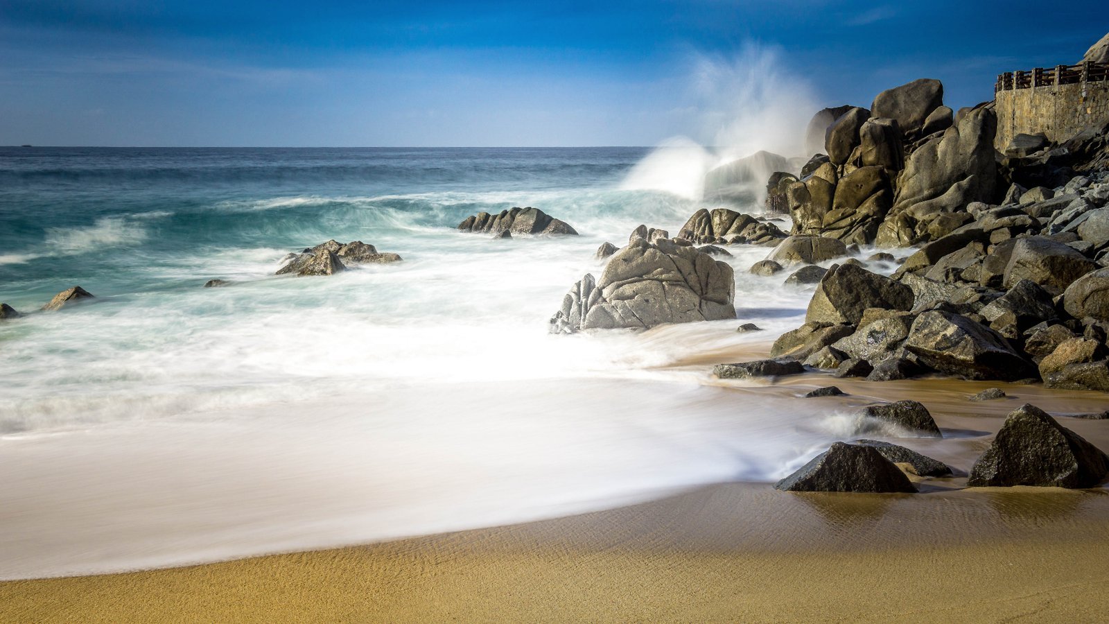 Dynamic scene of ocean waves crashing against rocky shores in Los Cabos, capturing the natural beauty of the coastal landscape.
