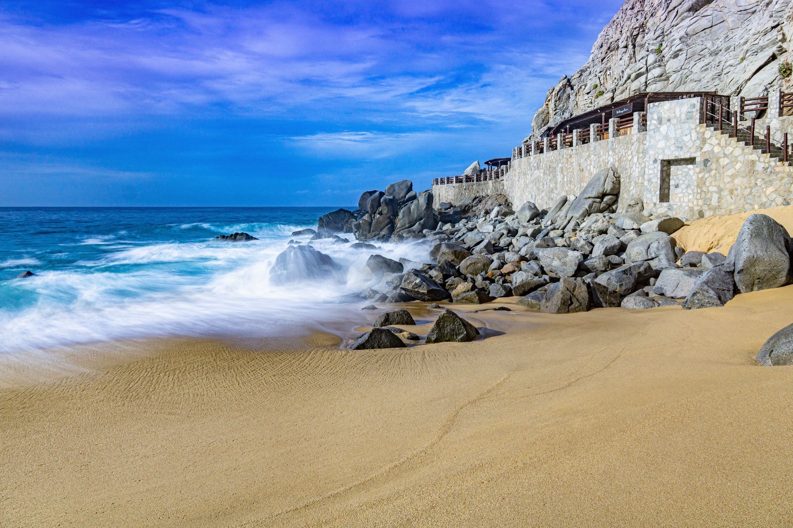 Capturing the rugged beauty of Los Cabos' coastline with ocean waves and rocky formations.