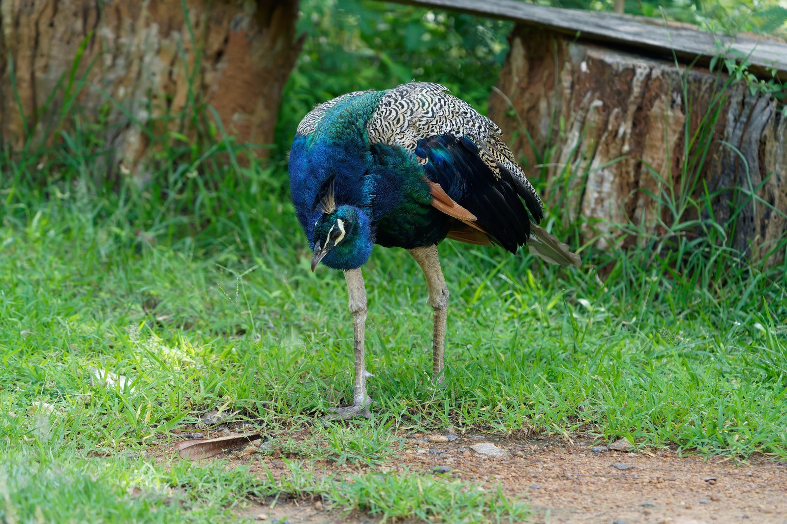 Peafowl standing on grass with lush greenery and a wooden structure in the background, showcasing its stunning plumage.